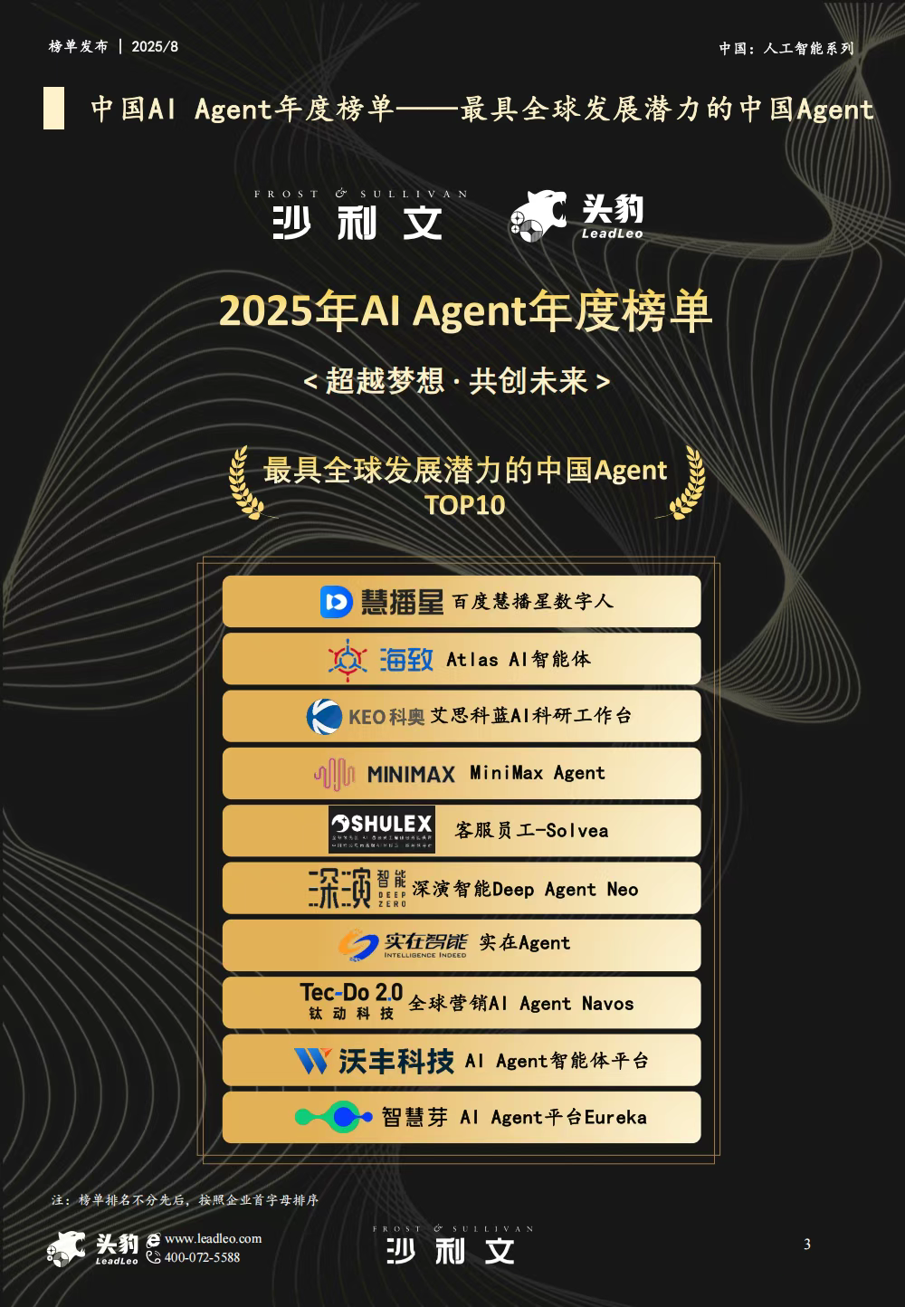 8月28日,全球知名咨询机构沙利文联合头豹研究院发布了《2025年中国AI Agent(智能体)最佳实践应用榜单》,凭借自主研发的 AI 智能体平台 Deep Agent Neo 的突出实力,哈希游戏智能从 150 家参评企业、近 300 个产品 / 解决方案中脱颖而出,成功入选 “最具全球发展潜力的中国 Agent” TOP10 榜单,再度印证其在 AI Agent 领域的技术硬实力与全球化发展潜力。